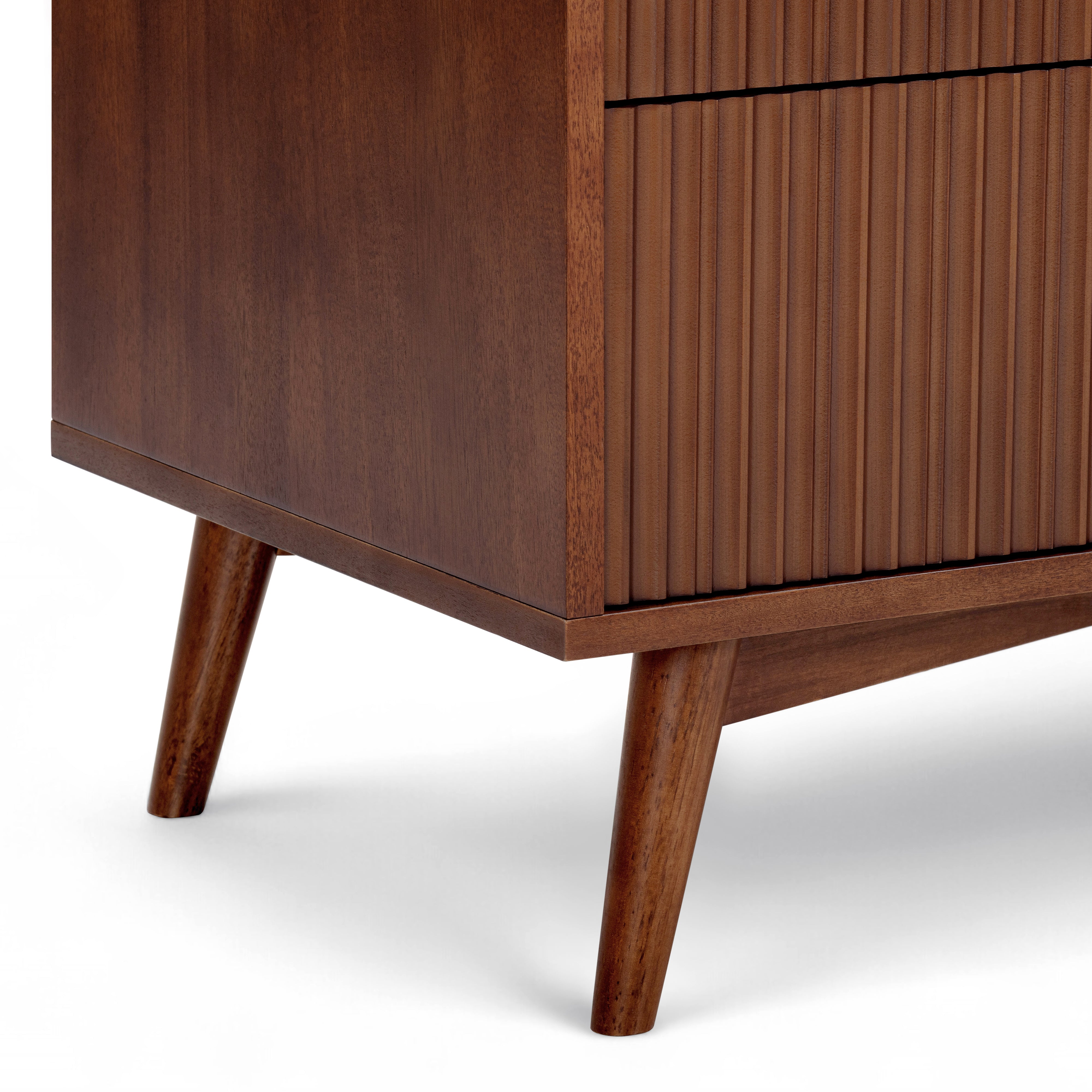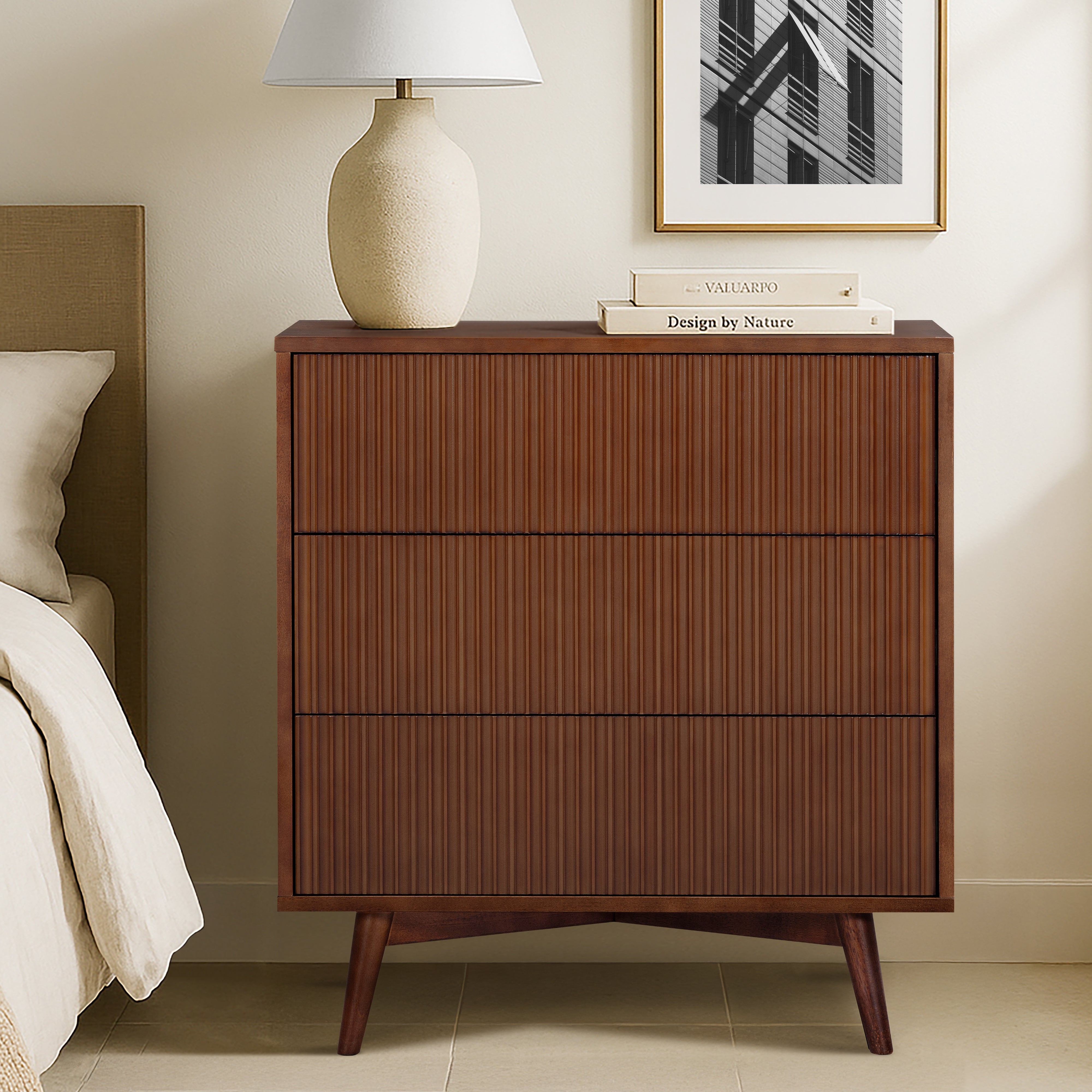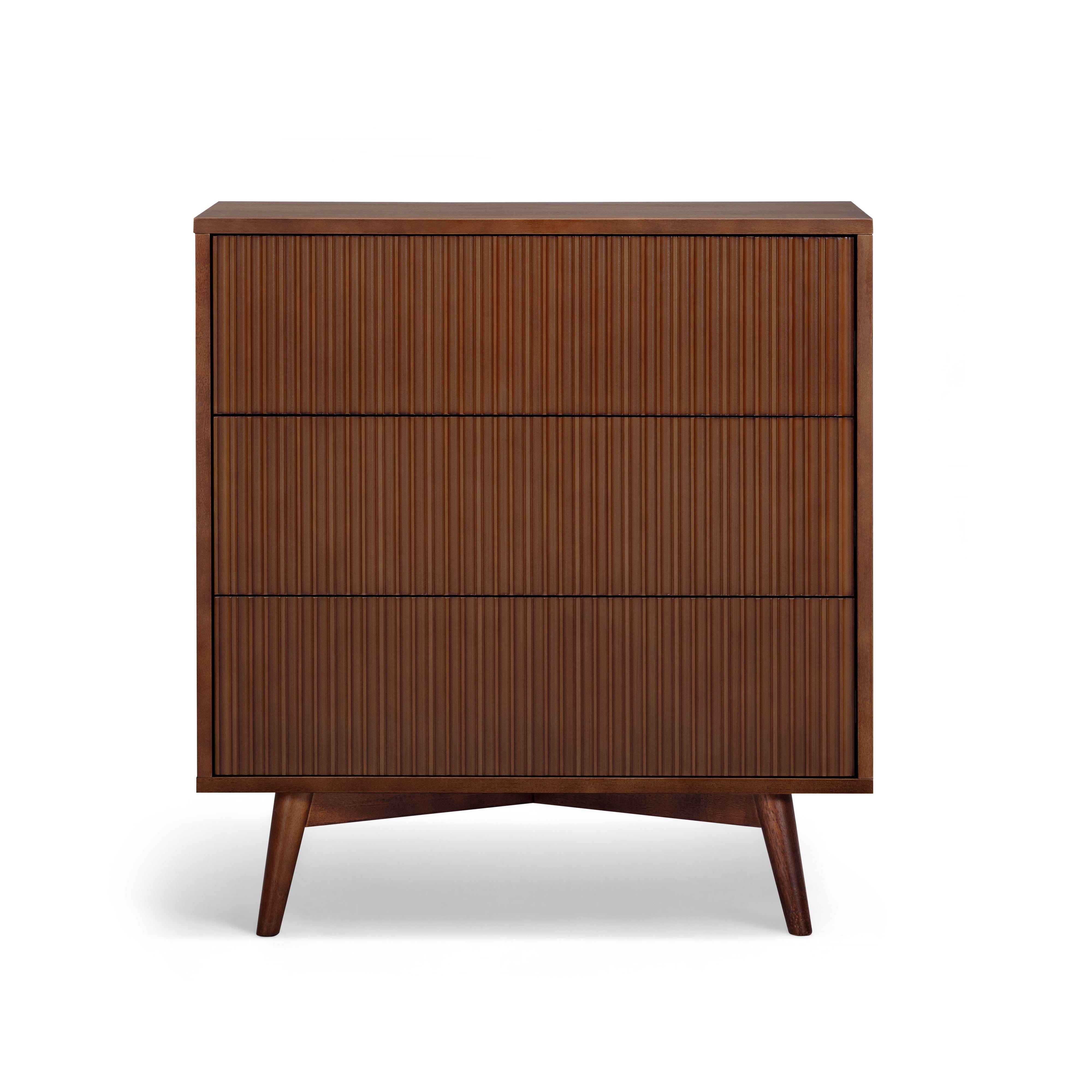 Fluted drawer fronts add texture, while the walnut finish introduces warmth and depth to bedroom interiors. The drawers operate smoothly, making daily use comfortable and reliable. The slim profile suits smaller bedrooms, guest rooms or apartments where space efficiency is important. A stable top surface allows for light styling or bedside use. This tall dresser provides practical storage with a refined, modern finish.