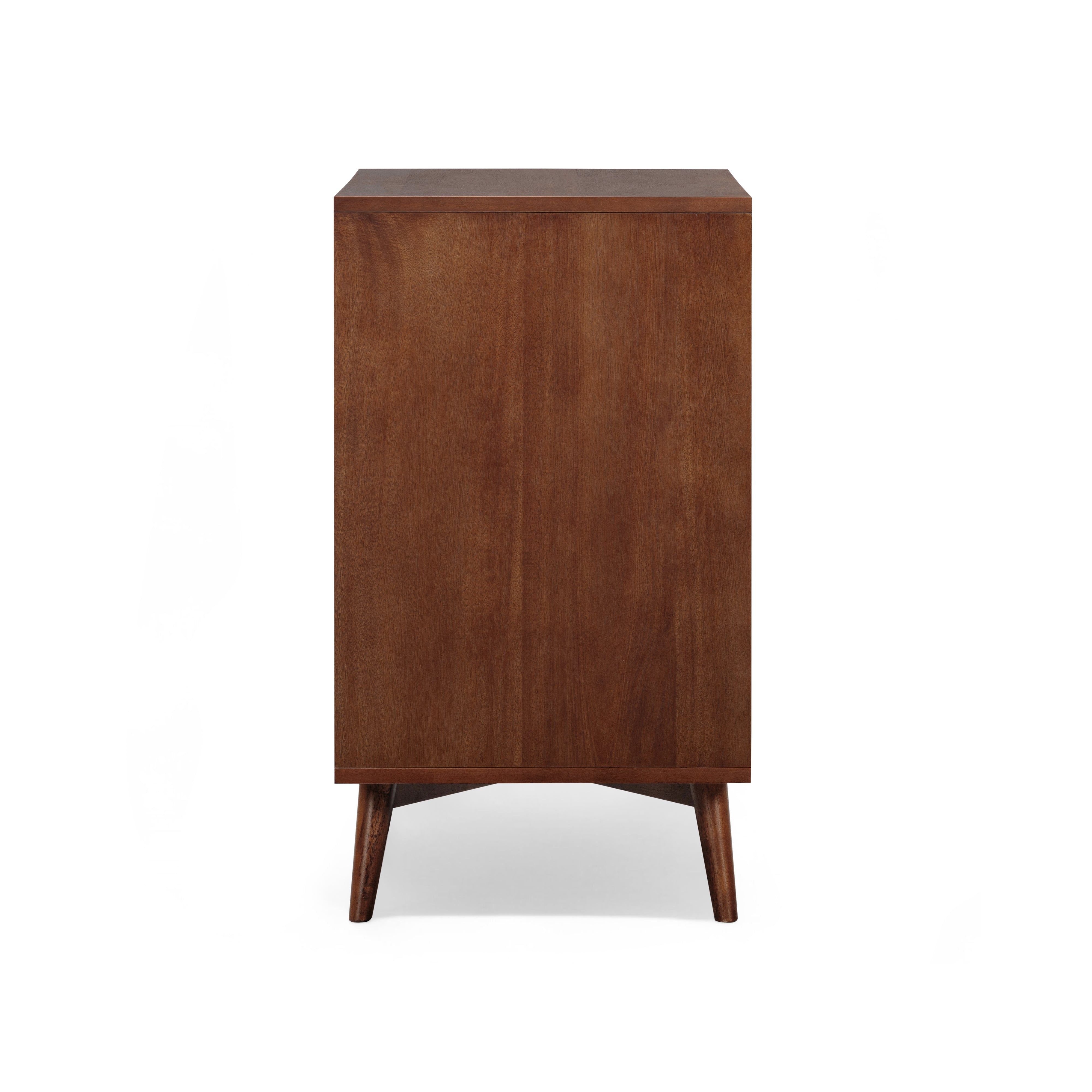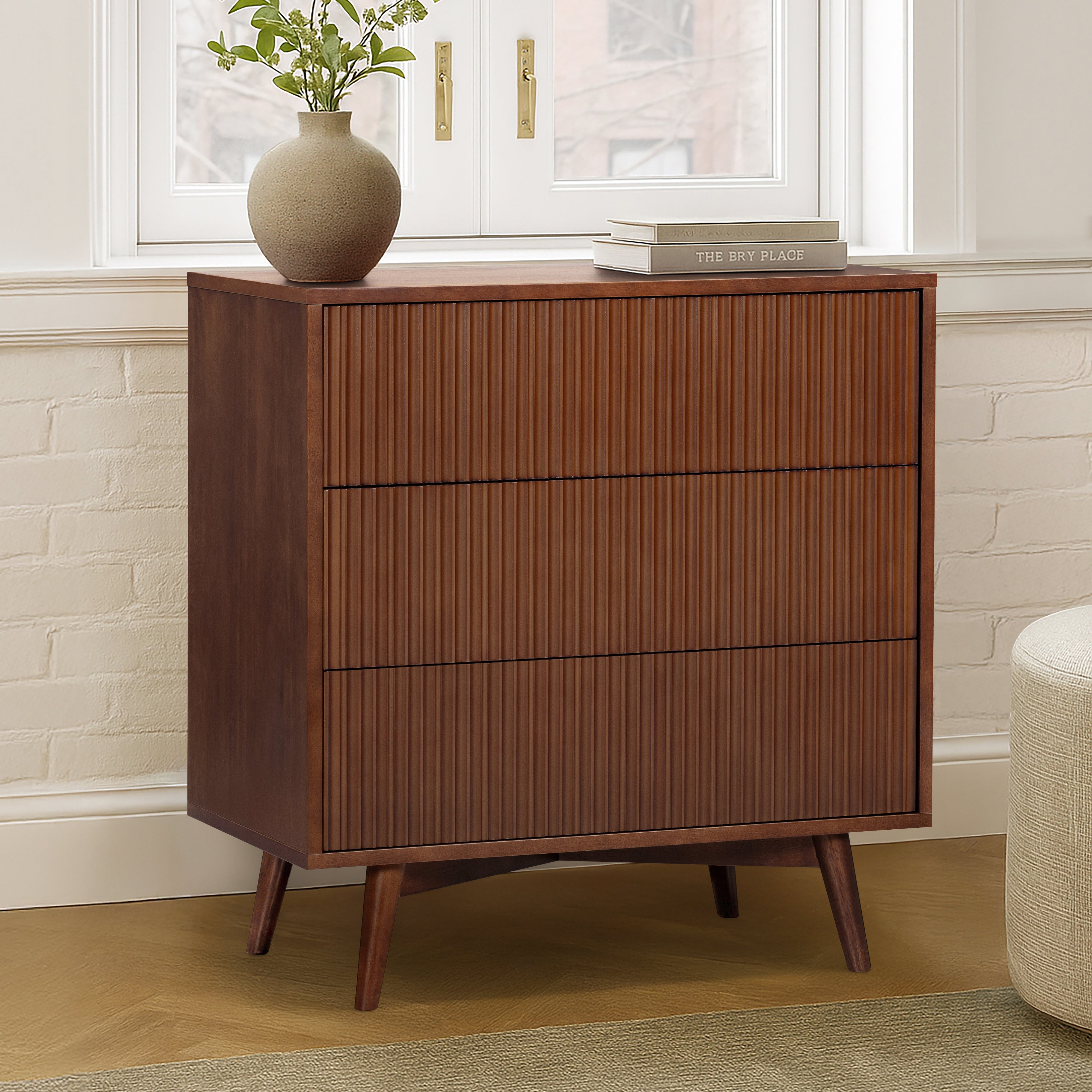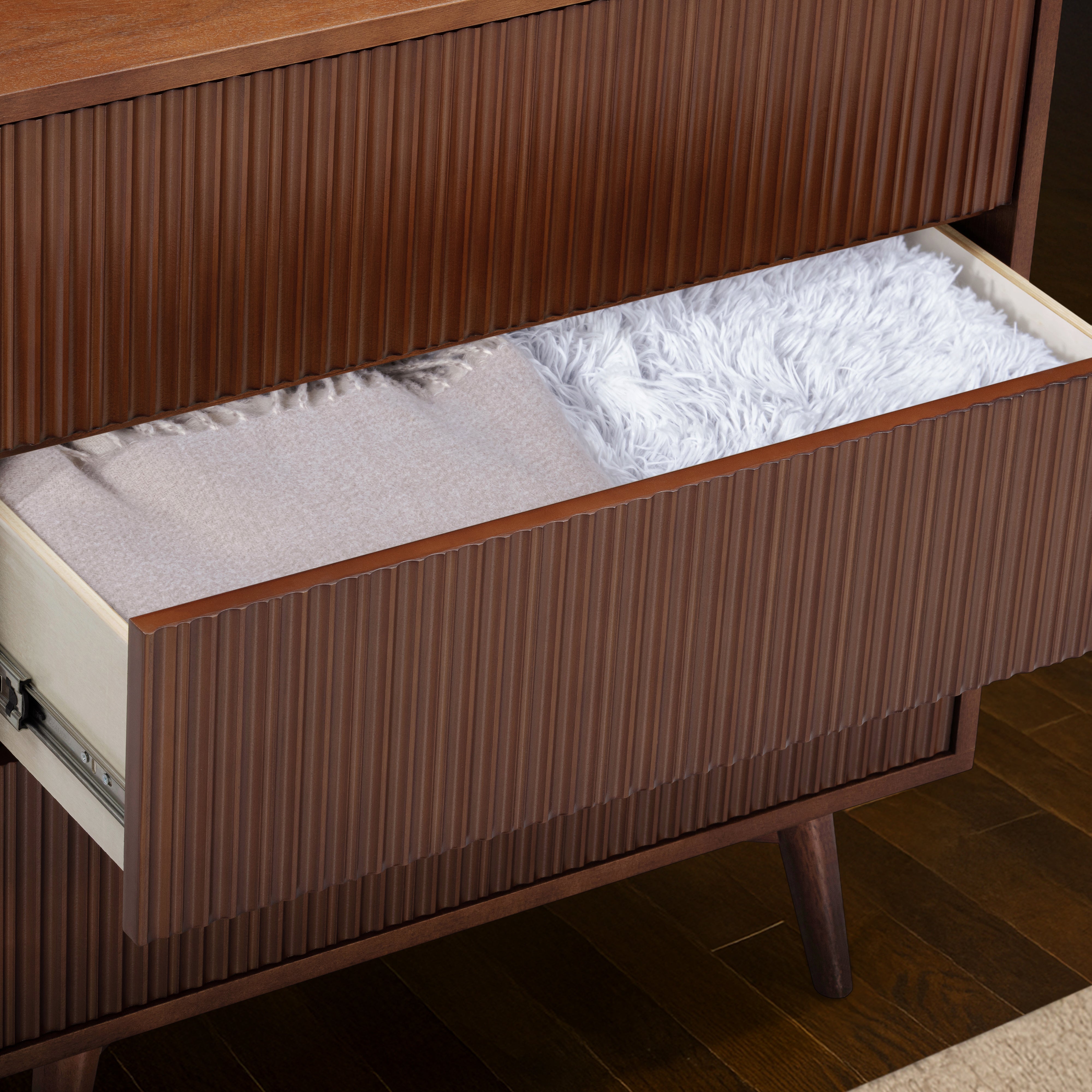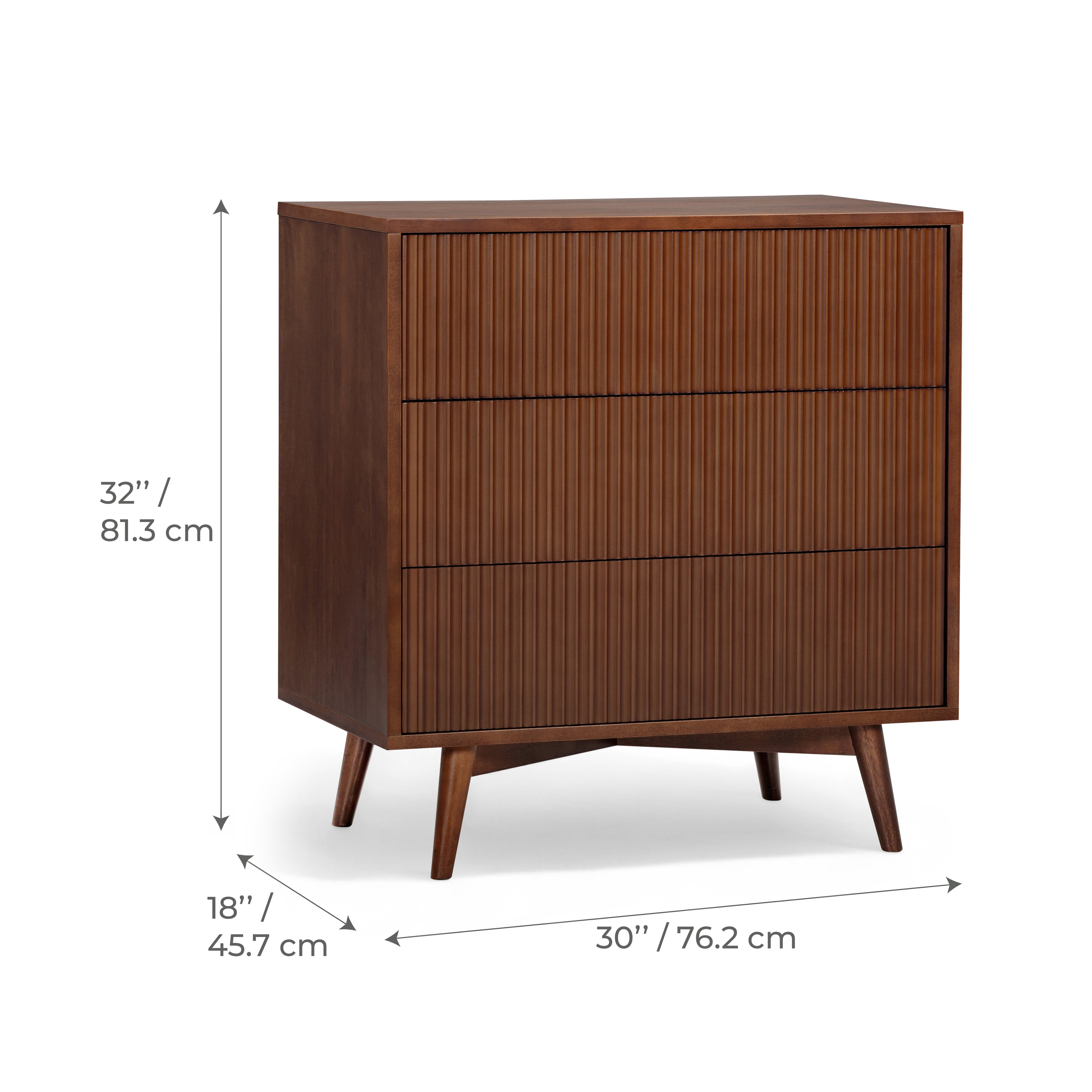 Fluted drawer fronts add texture, while the walnut finish introduces warmth and depth to bedroom interiors. The drawers operate smoothly, making daily use comfortable and reliable. The slim profile suits smaller bedrooms, guest rooms or apartments where space efficiency is important. A stable top surface allows for light styling or bedside use. This tall dresser provides practical storage with a refined, modern finish.