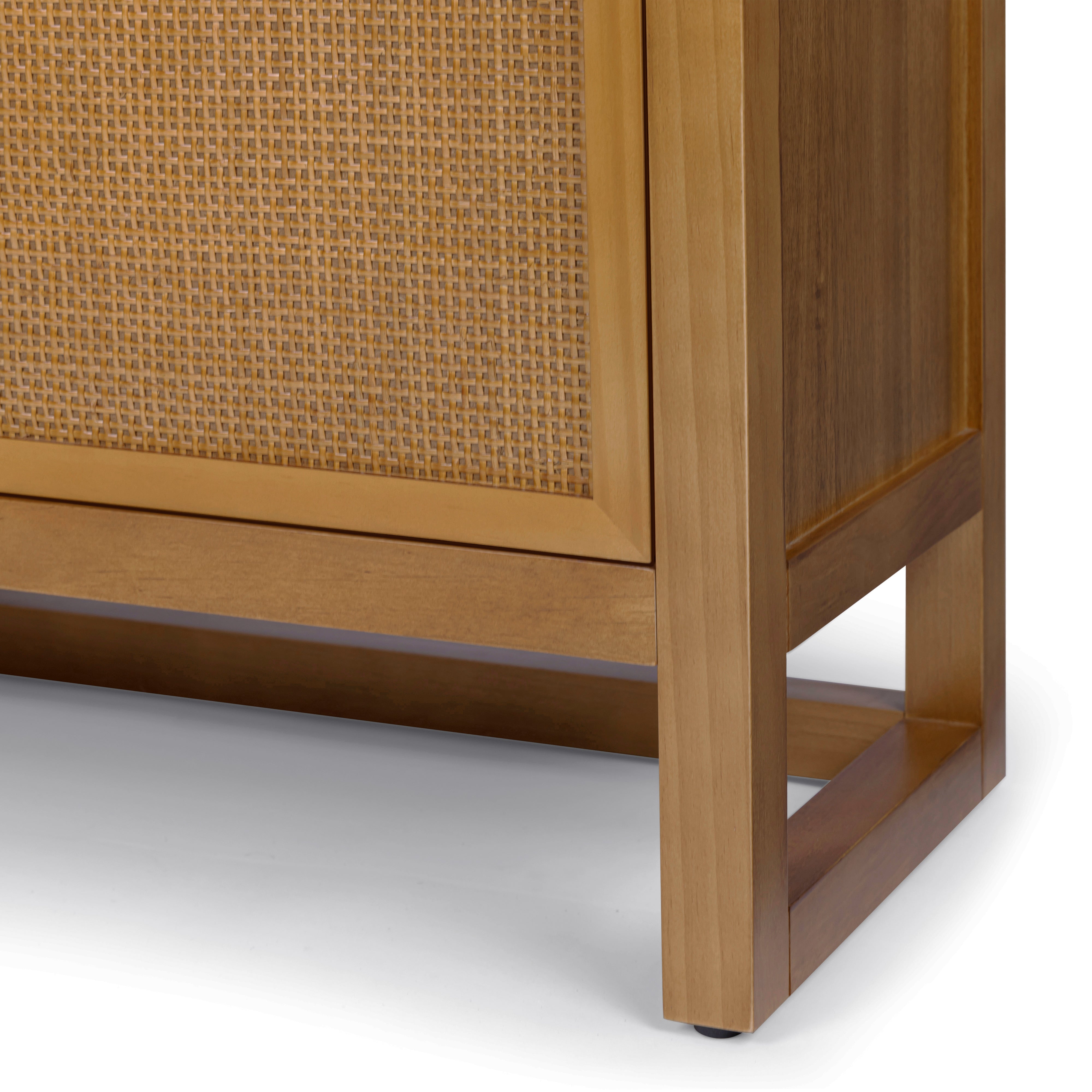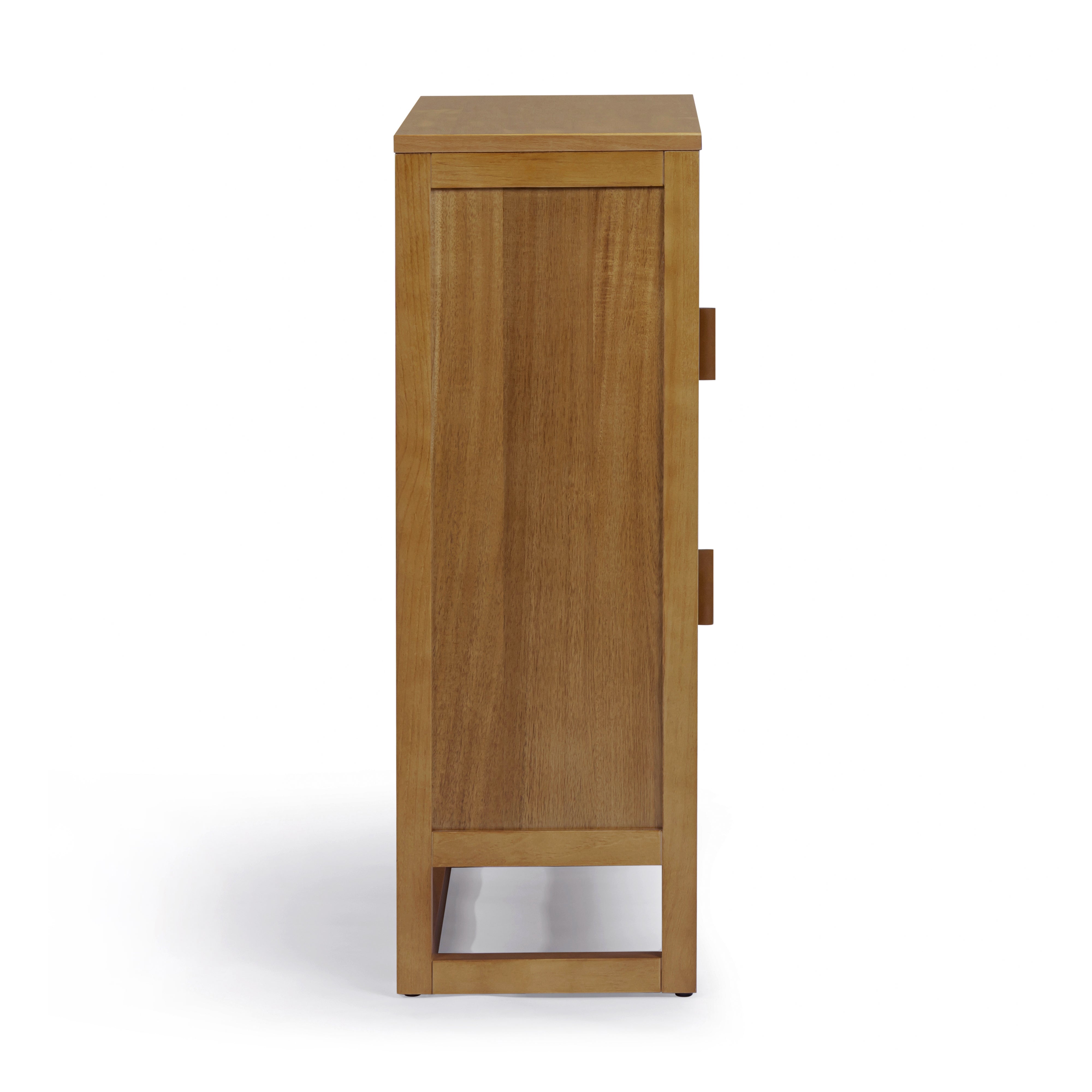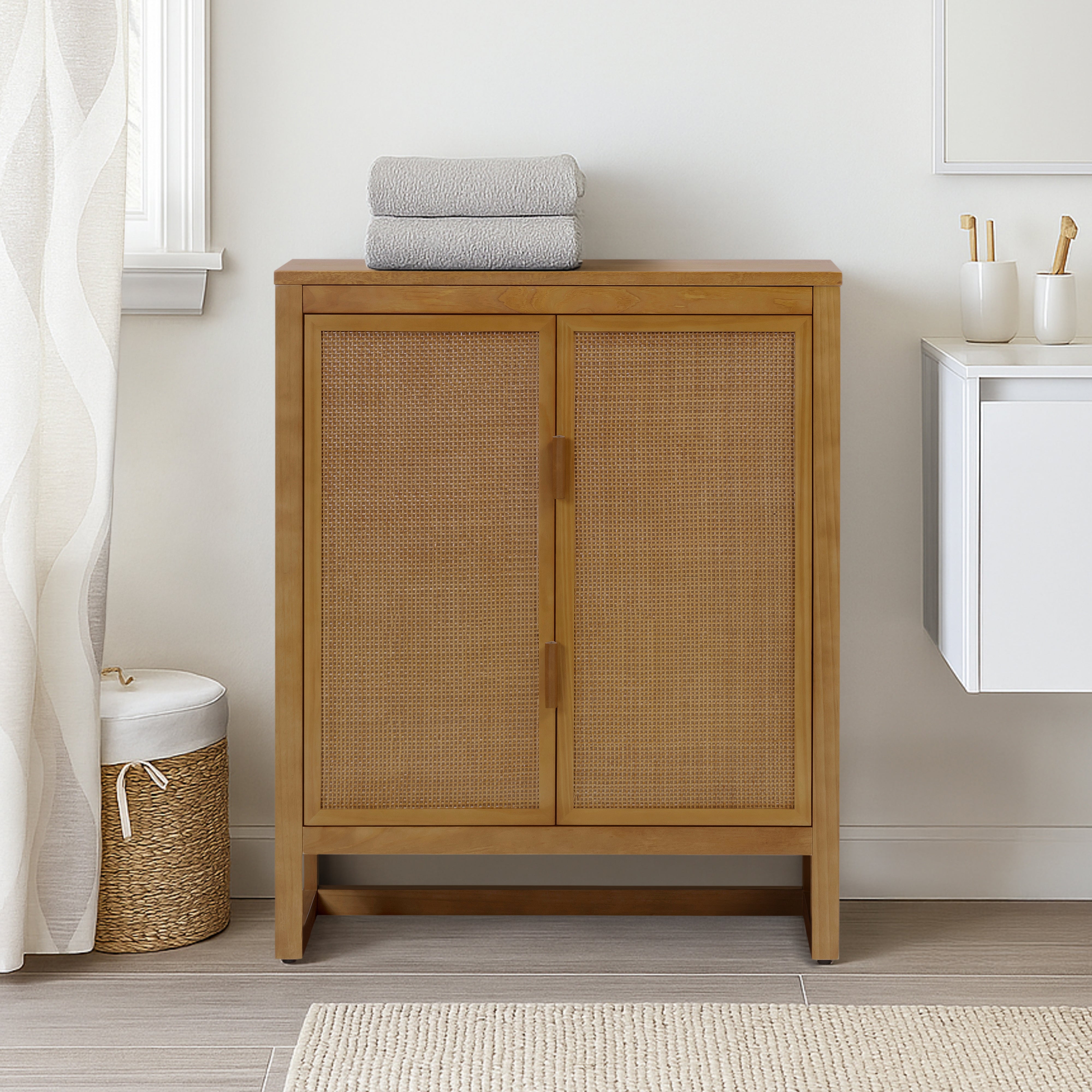 Built with a solid pine wood frame and MDF panels finished in acacia veneer, the cabinet offers durability and stability for everyday use. Rattan door panels add texture and soften the design, while the natural wood finish complements modern and transitional interiors. Adjustable shelving allows storage to be tailored to different needs, making the cabinet suitable for a range of spaces. The compact footprint makes it easy to place without overwhelming the room. This accent cabinet offers practical storage with relaxed, timeless styling.