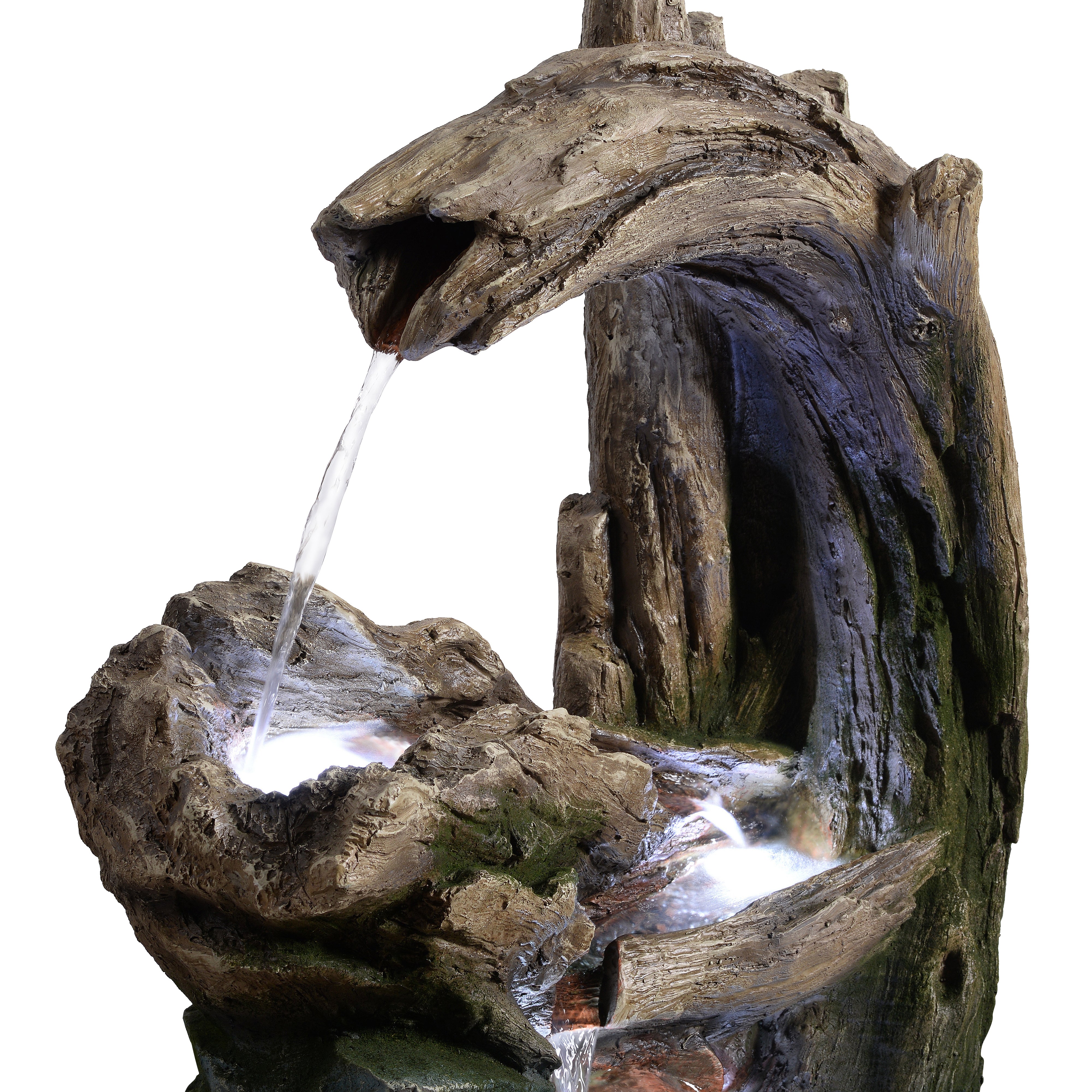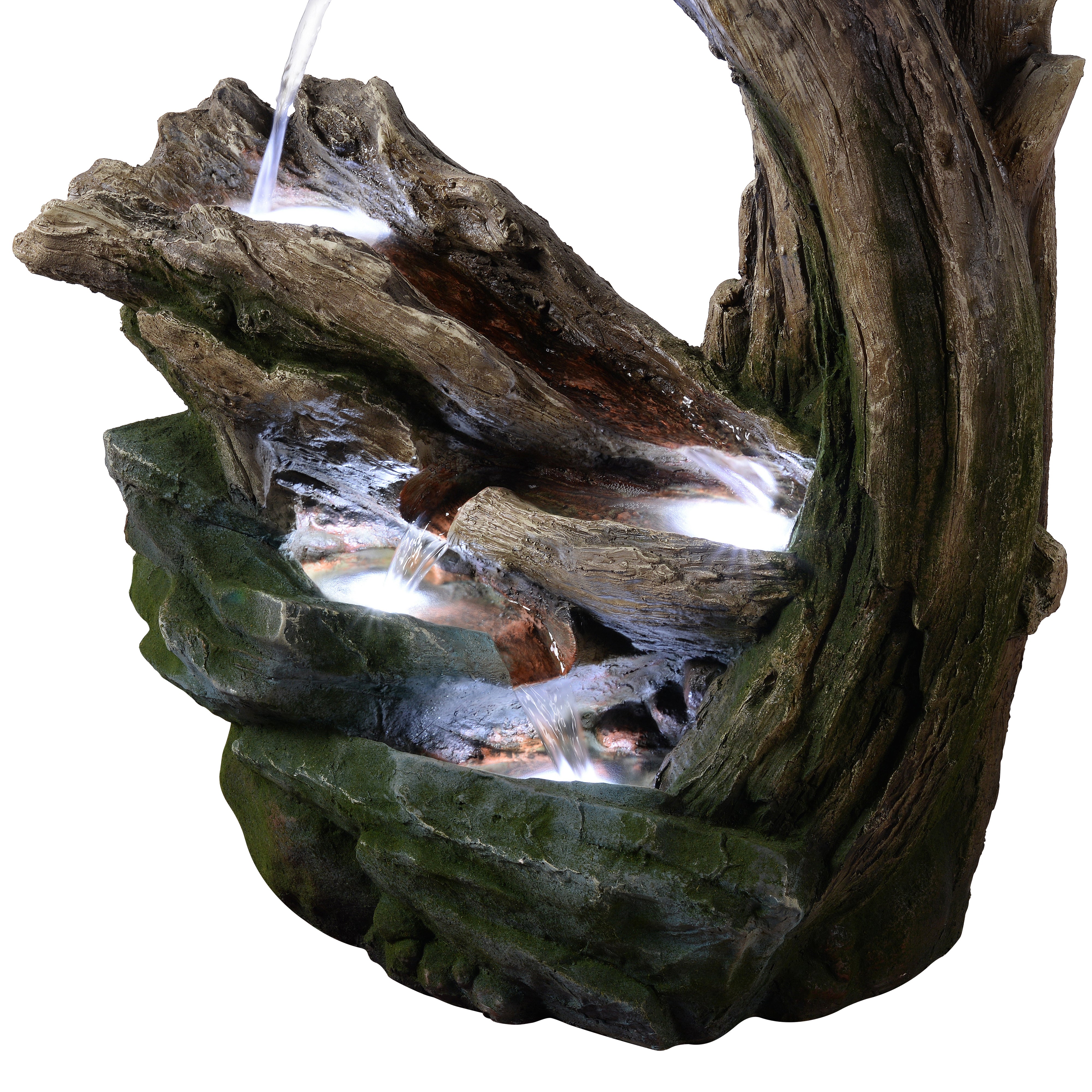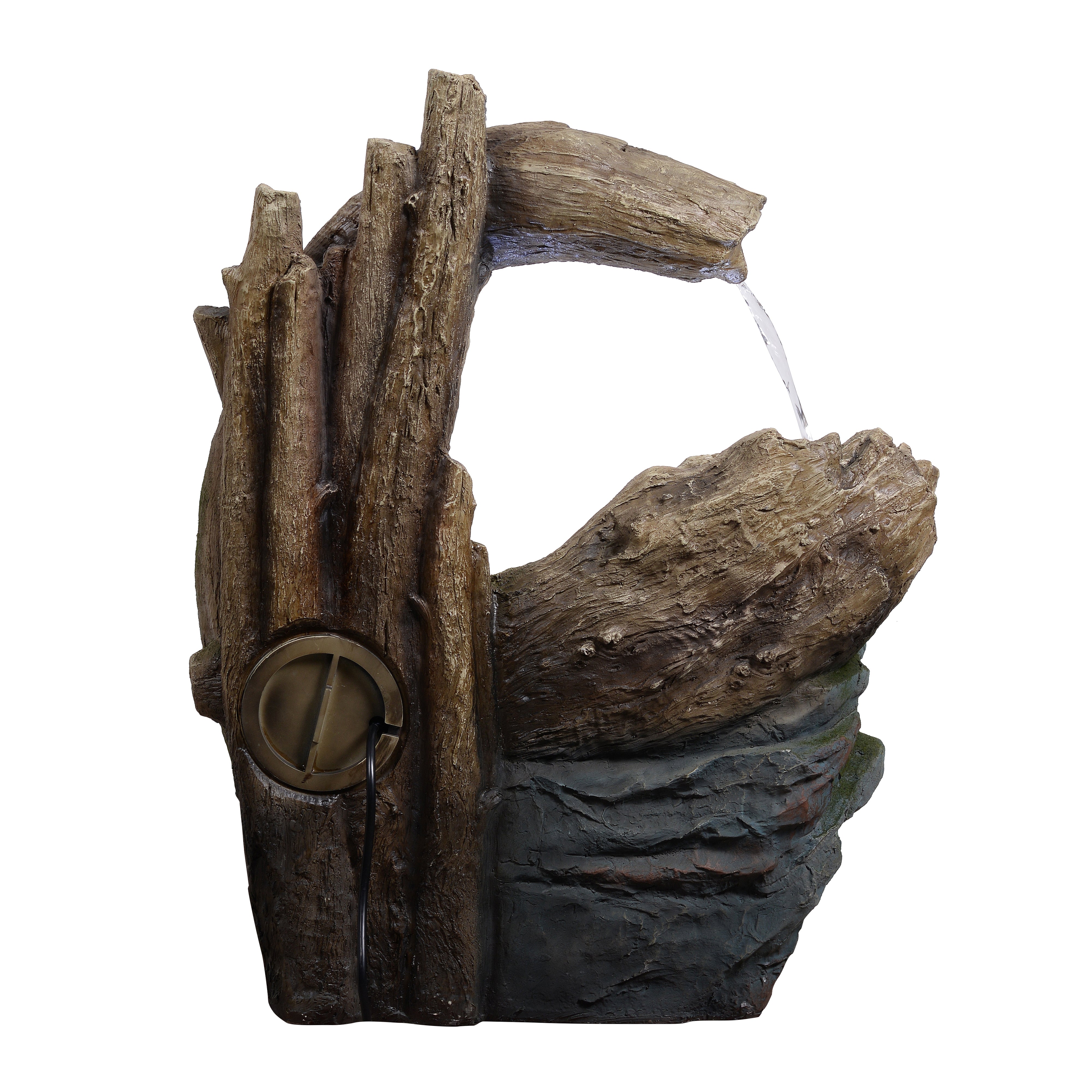 Integrated LED lights illuminate the flowing water, producing a warm glow that enhances evening ambience without overpowering the natural design. Crafted from durable polyresin, stone powder and fibreglass, the fountain captures the texture and detail of real rock and driftwood while remaining lightweight and weather-resistant. This construction ensures long-lasting outdoor performance while allowing easy positioning wherever you want to create a relaxing focal point. Installation is straightforward. Place the fountain on a stable, level surface, connect the pump and LED cables, fill the basin with clean water until the pump is fully submerged and plug into a GFCI-protected outdoor socket.