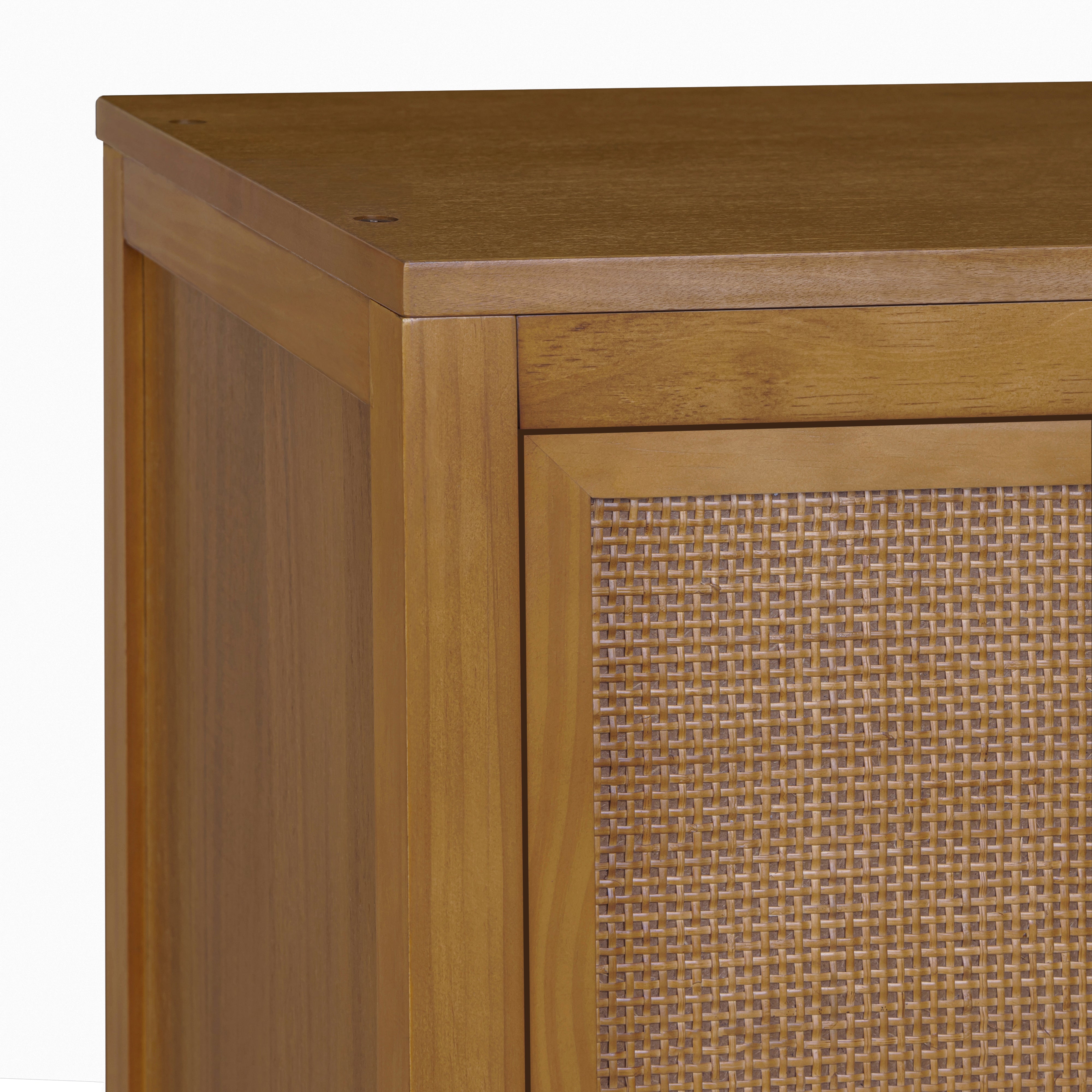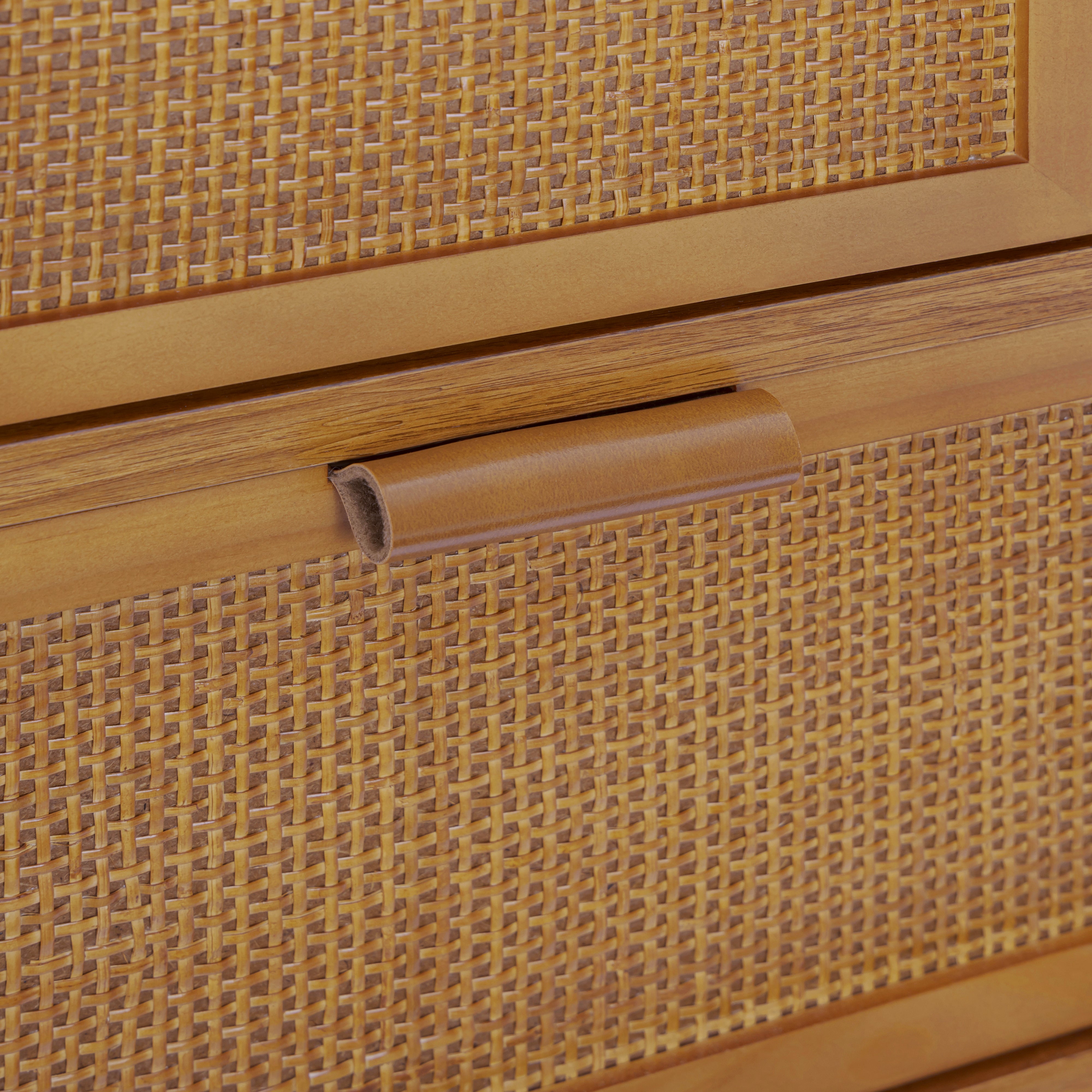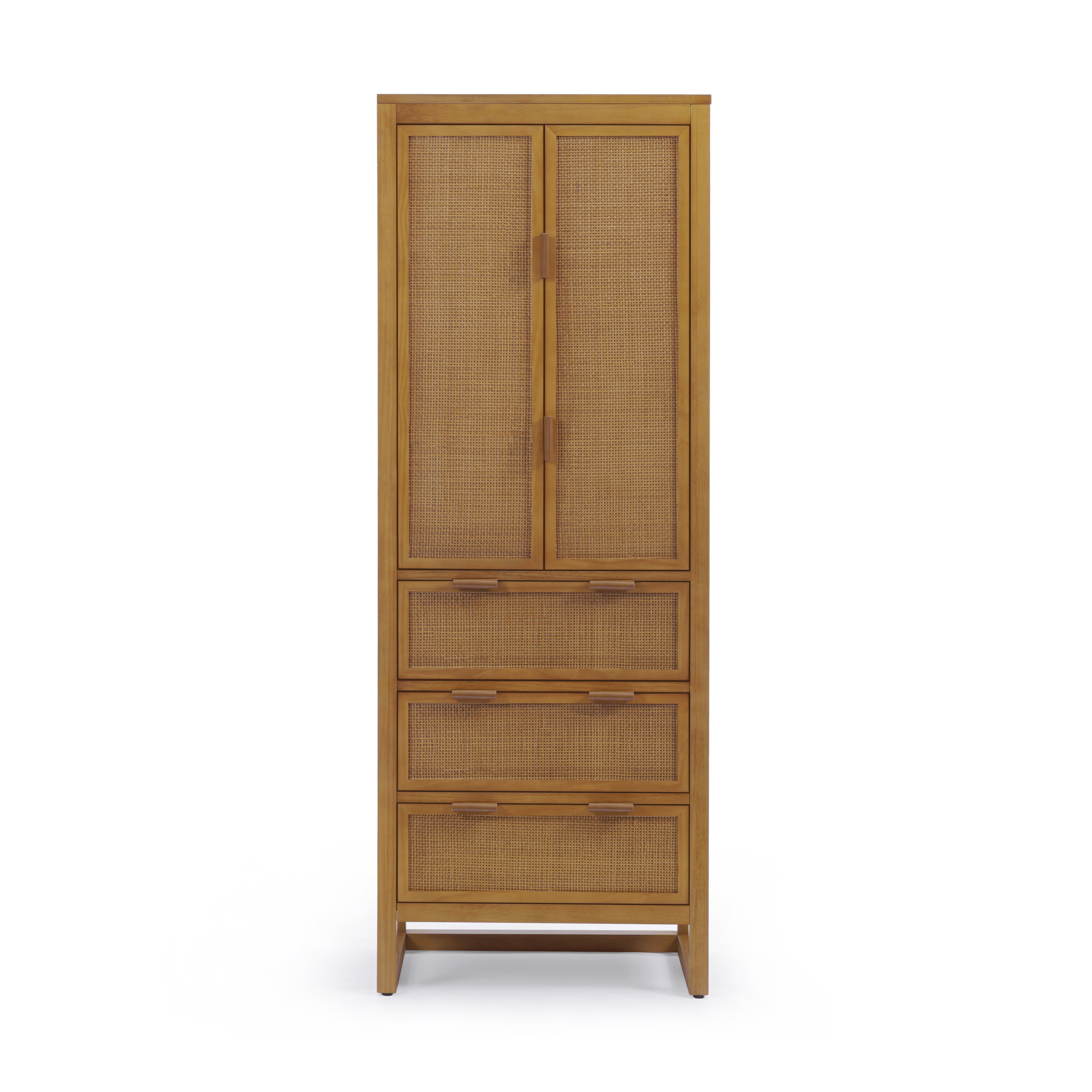 Rattan detailing adds texture and visual warmth, while the natural wood finish blends easily with a range of interior styles. Adjustable shelving allows storage to be customised to suit different items, helping keep spaces tidy and functional. Smooth drawer operation supports daily access, and the enclosed design keeps clutter out of sight. Designed for versatility, this cabinet provides reliable storage with understated style for a variety of rooms.