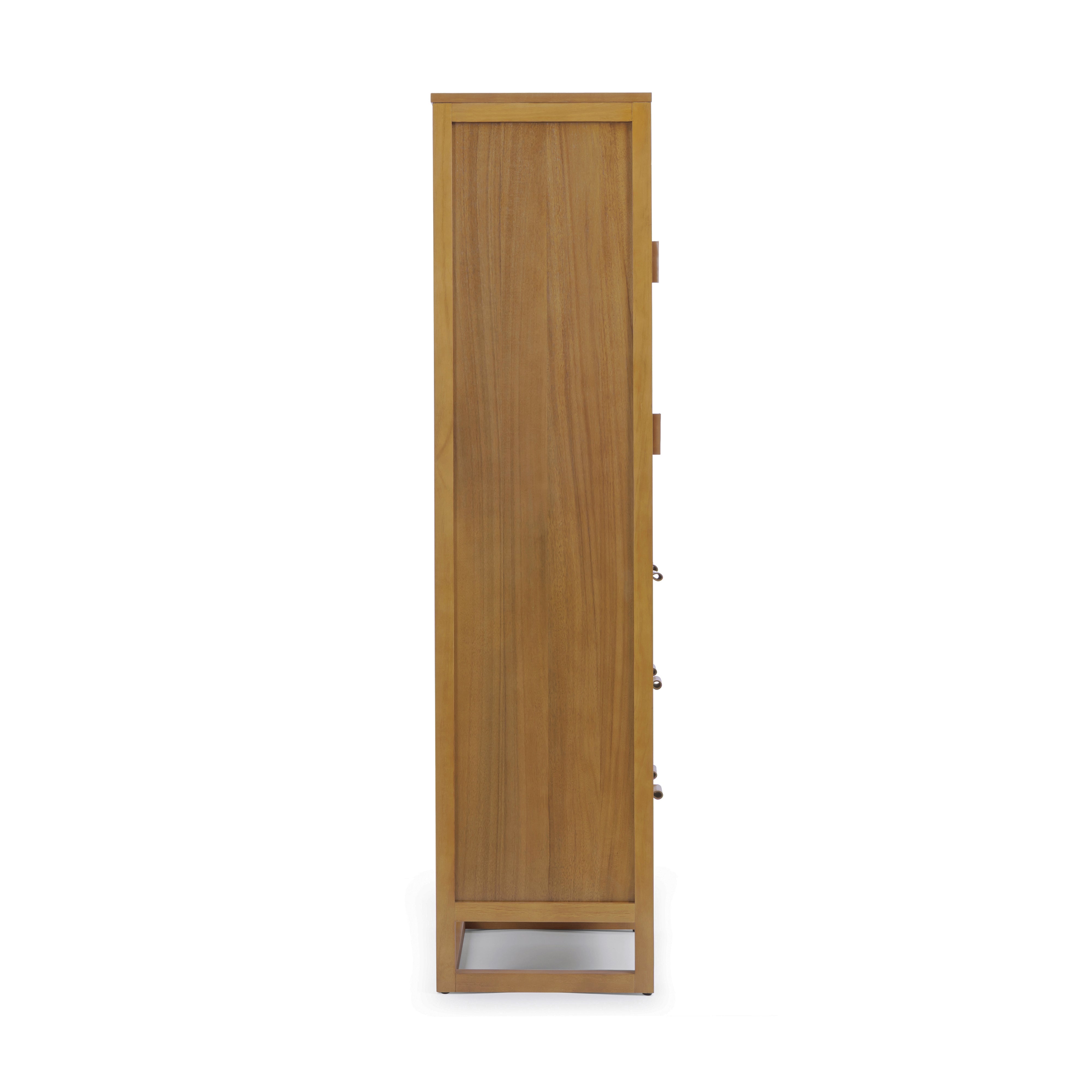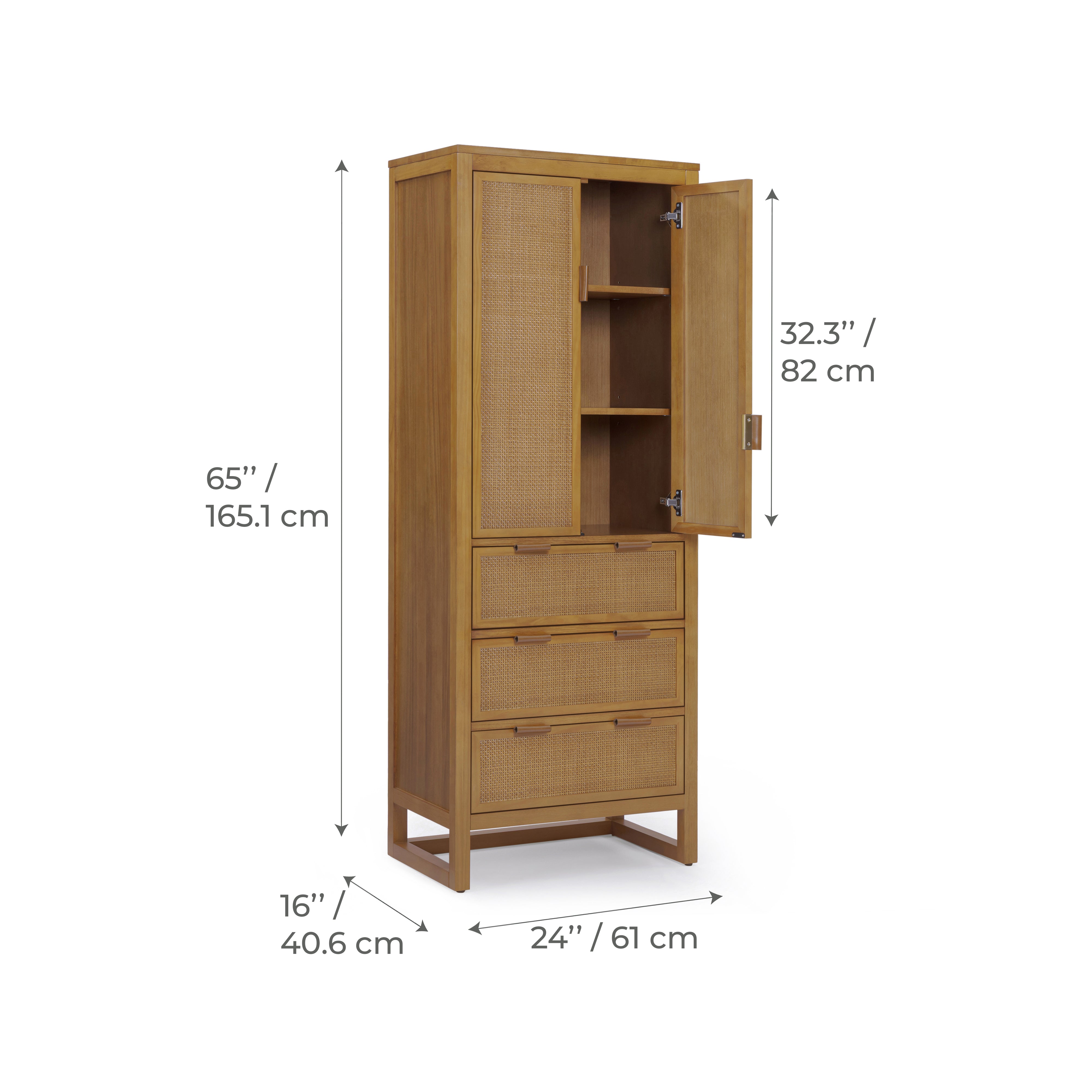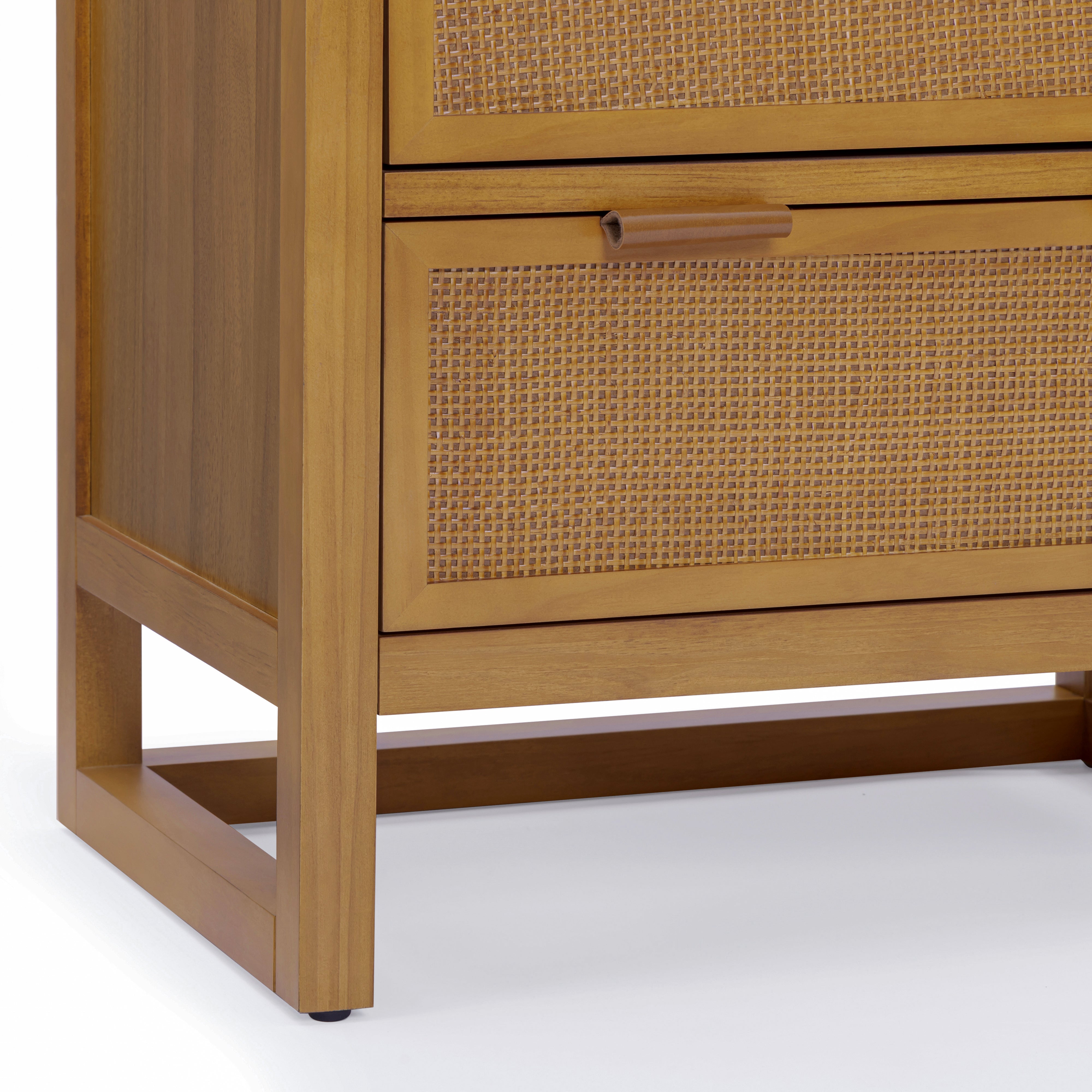 Rattan detailing adds texture and visual warmth, while the natural wood finish blends easily with a range of interior styles. Adjustable shelving allows storage to be customised to suit different items, helping keep spaces tidy and functional. Smooth drawer operation supports daily access, and the enclosed design keeps clutter out of sight. Designed for versatility, this cabinet provides reliable storage with understated style for a variety of rooms.