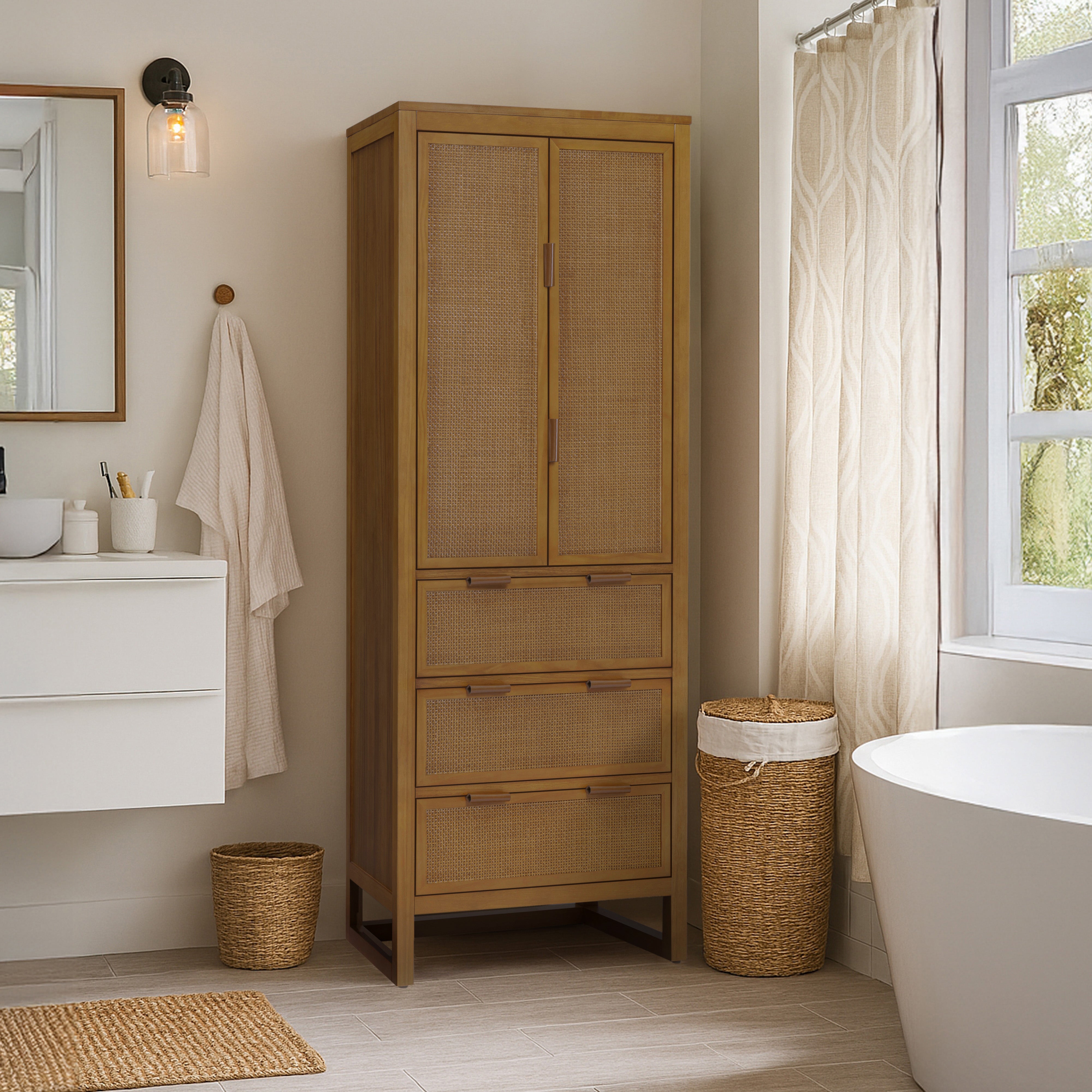 Teamson Home Hatteras Wooden Linen Cabinet 165cm tall with Rattan Doors, Natural