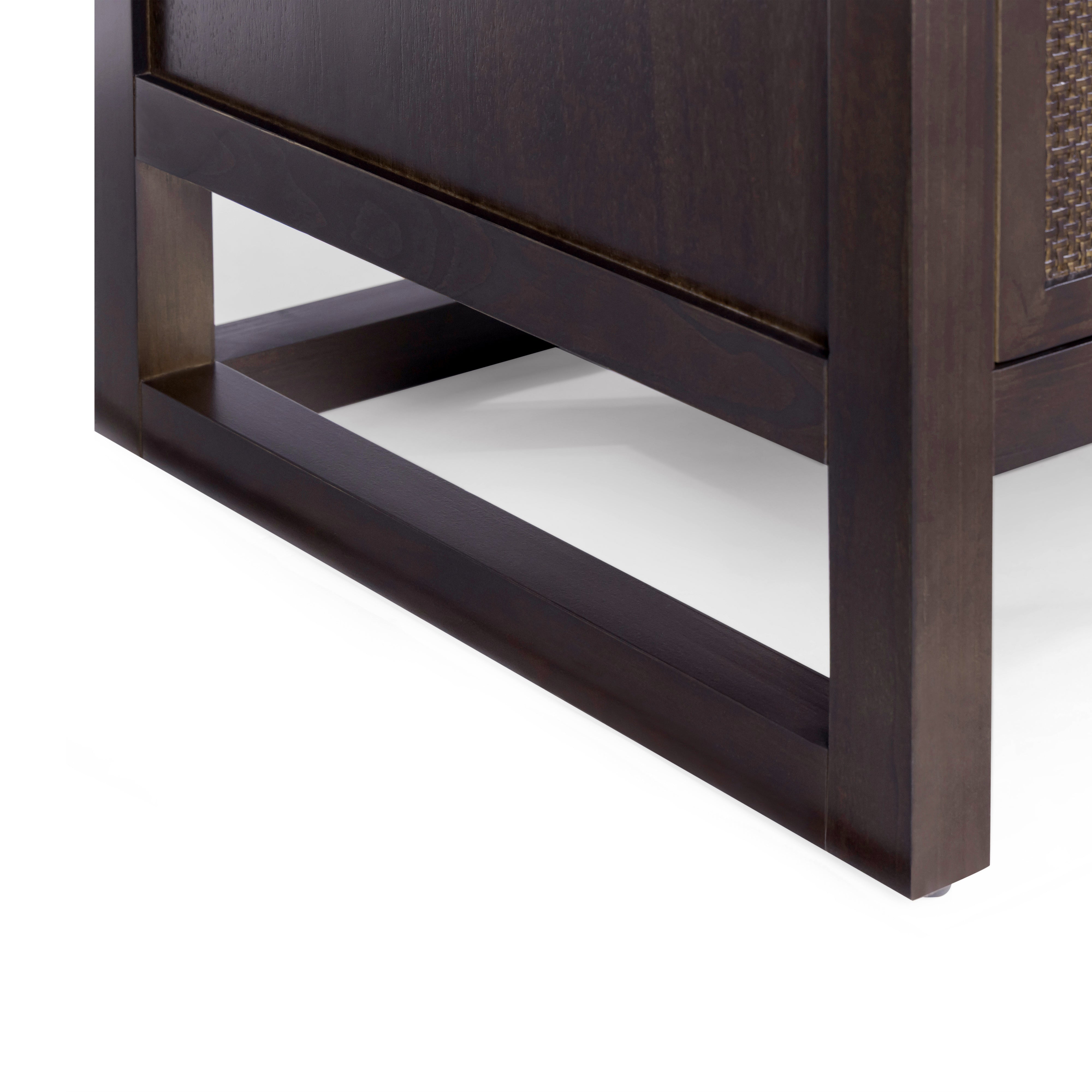 Rattan Inlay Door Panels: Woven texture adds warmth and contrast to the modern cabinet profile.