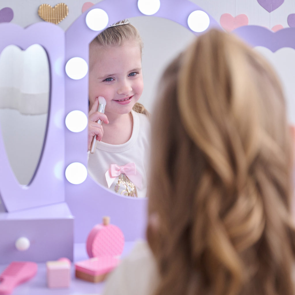 Turn daily routines into joyful, confidence building moments with this heart shaped purple play vanity set. Designed to encourage independence, creativity, and organization, this pretend makeup vanity becomes your child’s personal space to practice self-care, explore personal style, and develop healthy habits, while giving parents a break from constant reminders.