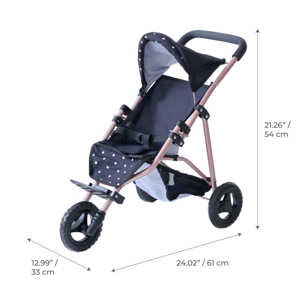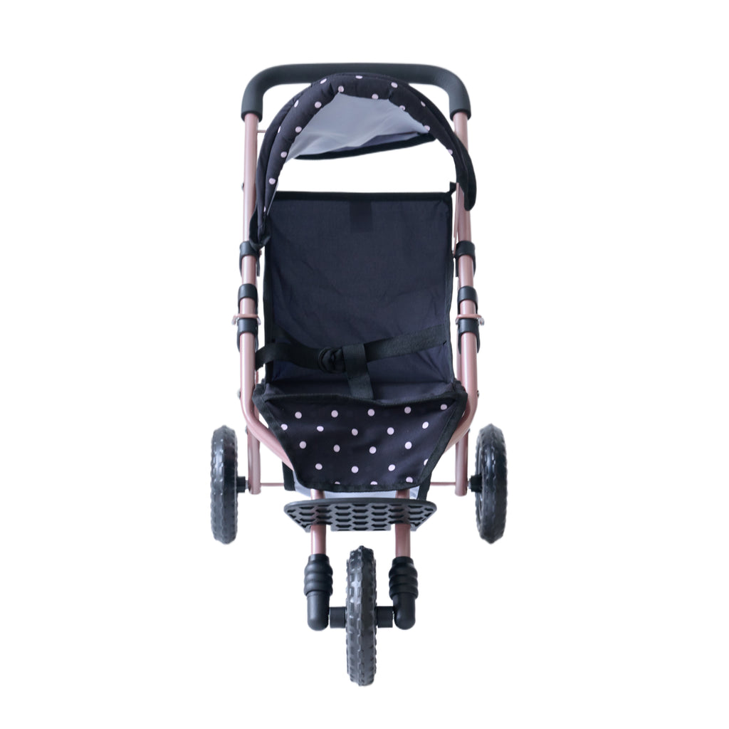 DESIGN: Black jogging-style stroller with pink polka dots, adjustable canopy, and roomy storage basket for nurturing role play.