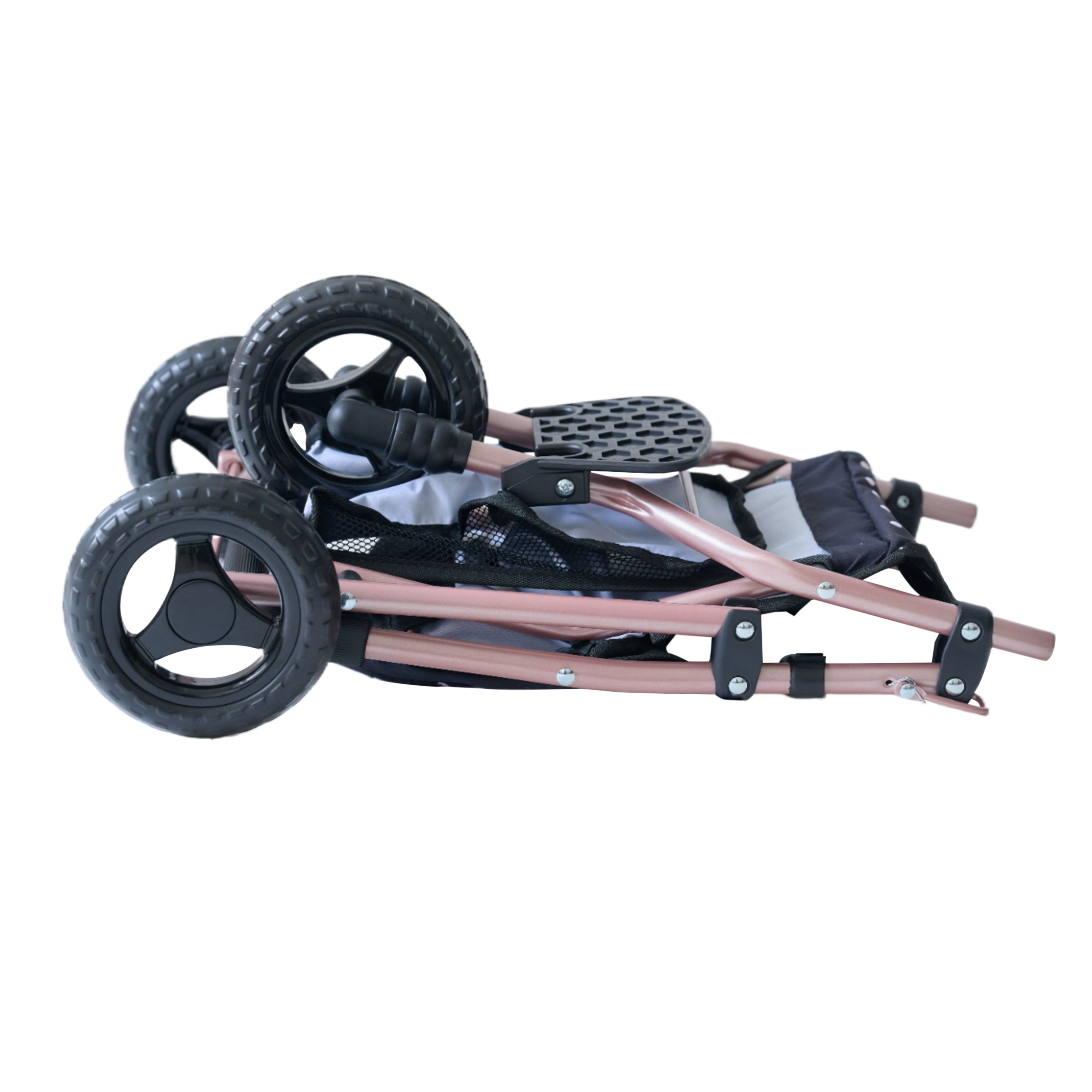 Smooth Rolling Wheels & Safety Lock System: Textured wheels and a padded rubber handle provide better grip and smooth control on various surfaces. The stroller folds easily for storage, with a safety lock to keep it securely open during play.
